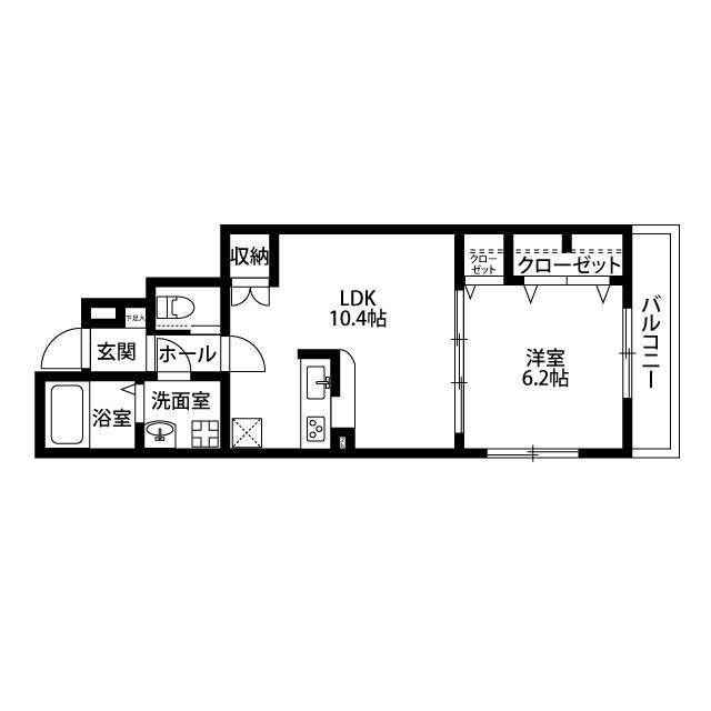 | 間取り | 1LDK(1DK) LDK 10.4畳 × 1室, 洋 6.2畳 × 1室 |